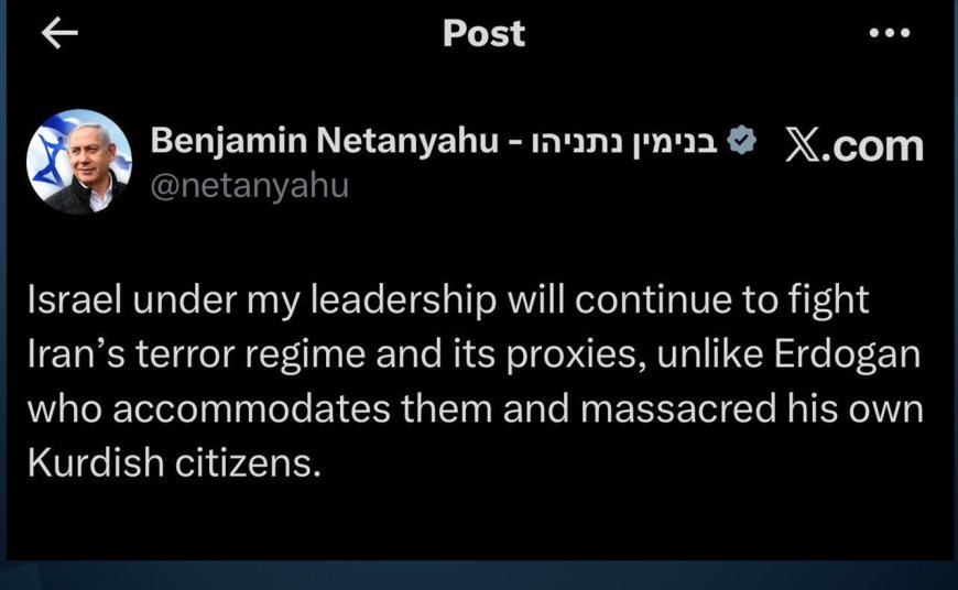 İsrail Başbakanı Binyamin Netanyahu X hesabı üzerinden İran’a karşı savaşı sürdüreceğini ifade ederken Türkiye Cumhurbaşkanı Recep Tayyip Erdoğan’ı hedef alan bir paylaşımda bulundu. Netanyahu, "Benim liderliğim altında İsrail, İran’ın terör rejimi ve onun vekil güçleriyle savaşmaya devam edecek; Erdoğan’ın aksine, o bu yapılarla uyum sağlıyor ve kendi Kürt vatandaşlarını katletti" ifadelerini kullandı.